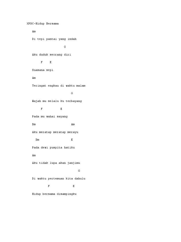 HIDUP BERSAMA XPDC oleh BukharyBab Am Di tepi pantai yang indah G Aku duduk seorang diri F E Suasana sepi Am Teringat engkau di waktu malam G Wajah mu selalu ku terbayang F E Pada mu wahai sayang Dm Am Aku meratap meratap merayu Dm E Pada dewi puspita hatiku Am Aku. Kumpulan lirik lagu indonesia dan dunia. Negara ini punya sejuta keindahan dan keunikan fauna dan flora alhamdulillah.